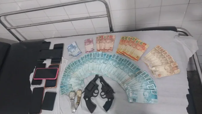 Com os suspeitos, os policiais encontraram duas armas de fogo do tipo revólver calibre .38, além de sete aparelhos celulares e dinheiro em espécie, produtos do roubo. Também foram apreendidos “toucas ninjas” e abraçadeiras de nylon, materiais comumente utilizados para intimidar vítimas durante ações criminosas.