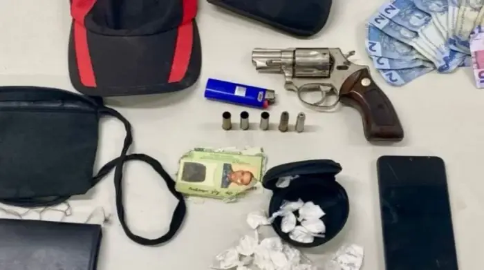 Durante a ação, os policiais apreenderam um revólver Taurus calibre .38, com acabamento inox e coldre, além de três munições deflagradas e duas intactas. Também foram recolhidos um aparelho celular, 19 porções de cocaína, R$ 25 em dinheiro, uma pochete e um boné.