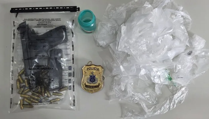 As equipes se deslocaram até o endereço apontado e, após autorização do morador, localizaram uma pistola acondicionada em uma bolsa, acompanhada de diversas munições calibre 9 mm, além de embalagens utilizadas para o acondicionamento de drogas, em uma residência situada no andar superior do imóvel.