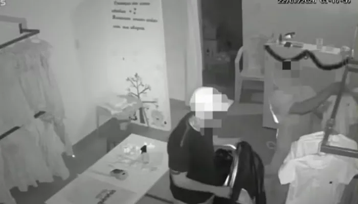 As imagens de câmeras de segurança do local registraram o momento em que os homens arrombaram a porta de ferro, retiraram as roupas das araras, colocaram em sacos plásticos e levaram todo o estoque do estabelecimento.