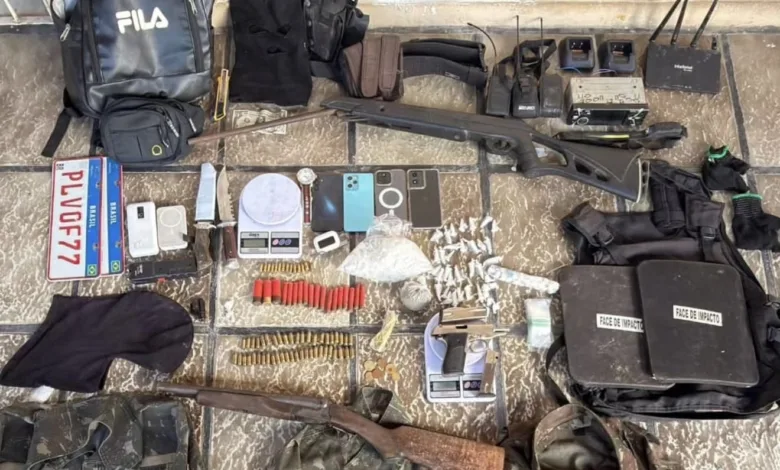 Após a troca de tiros, os suspeitos conseguiram fugir pela vegetação, abandonando o acampamento e todo o material ilícito. Na varredura da área, os policiais apreenderam uma carabina calibre 12, uma pistola calibre .380, uma espingarda de fabricação artesanal, um colete balístico, 25 pinos de substância análoga à cocaína, blusões camuflados, além de outros objetos utilizados pela organização criminosa.