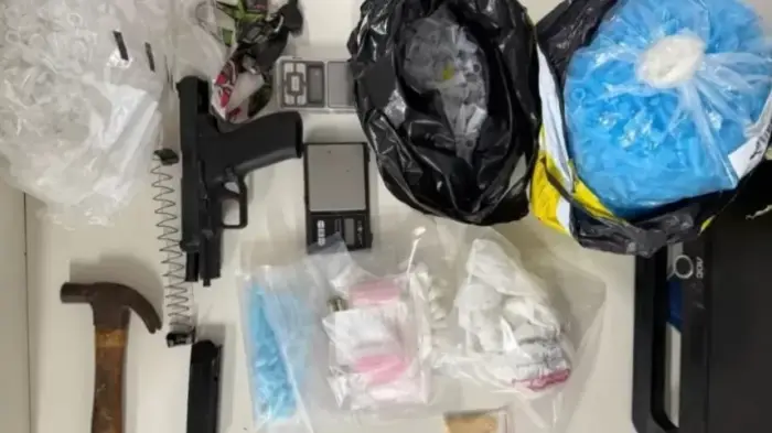 Com o suspeito, os policiais encontraram uma pistola calibre 9mm, 11 munições do mesmo calibre e uma quantidade considerável de entorpecentes. Foram apreendidos 39 pinos azuis e 35 pinos transparentes contendo substância semelhante à cocaína, além de uma quantidade adicional da droga, acondicionada em um saco plástico.