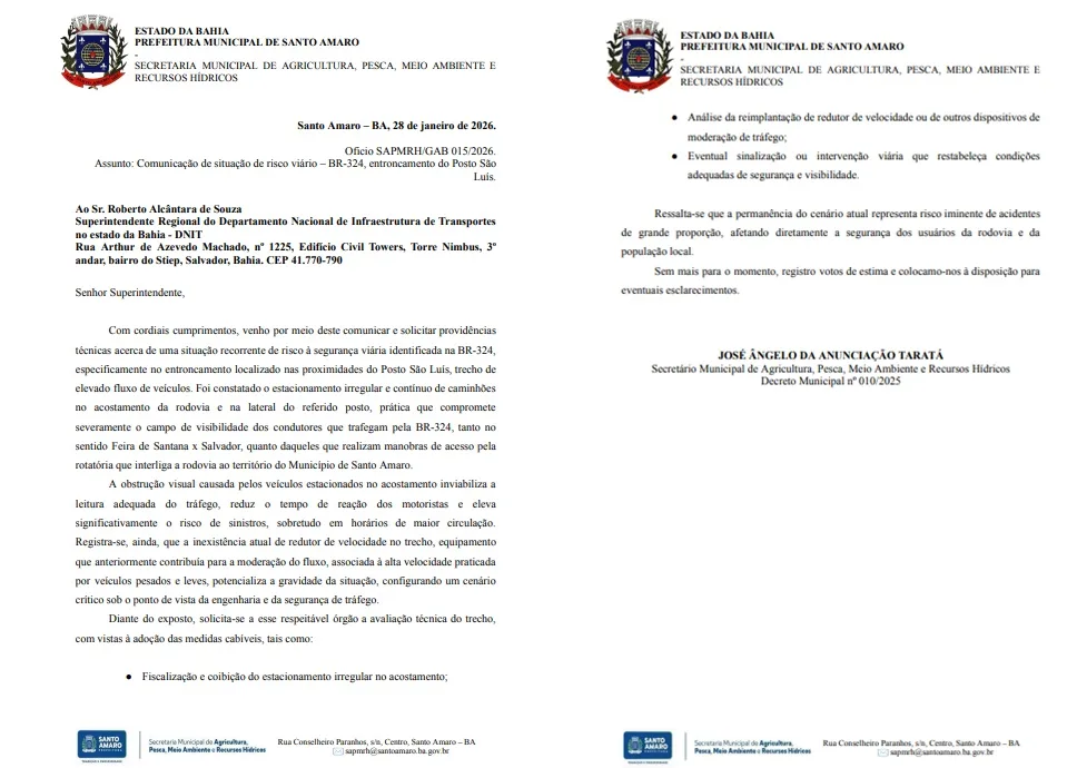 O secretário municipal de Agricultura, Pesca, Meio Ambiente e Recursos Hídricos de Santo Amaro, José Ângelo da Anunciação, conhecido como Xuxu, encaminhou um ofício ao Departamento Nacional de Infraestrutura de Transportes (DNIT) alertando para uma situação crítica de risco viário na BR-324, no entroncamento próximo ao Posto São Luís.
