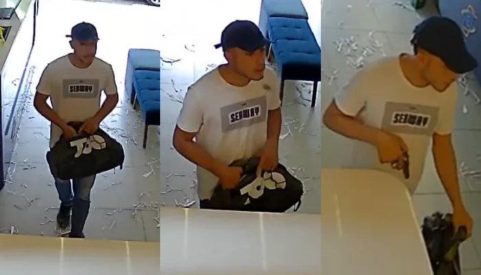 De acordo com as imagens da câmera de segurança, o criminoso chegou à loja por volta das 12h usando uma bolsa preta e vestindo uma camisa branca, calça jeans e boné preto. Armado, ele rapidamente rendeu os funcionários e uma cliente. Sob ameaça, o assaltante exigiu que todos entregassem seus celulares e outros pertences. Além disso, ele levou aparelhos eletrônicos expostos nas prateleiras da loja.
