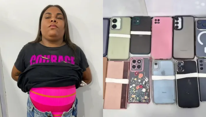 Durante as buscas e com base nas características repassadas, as equipes identificaram uma mulher em atitude suspeita. Ao perceber a aproximação dos policiais, ela tentou fugir, mas foi alcançada, abordada e detida. Com a suspeita, os militares encontraram 16 celulares furtados.