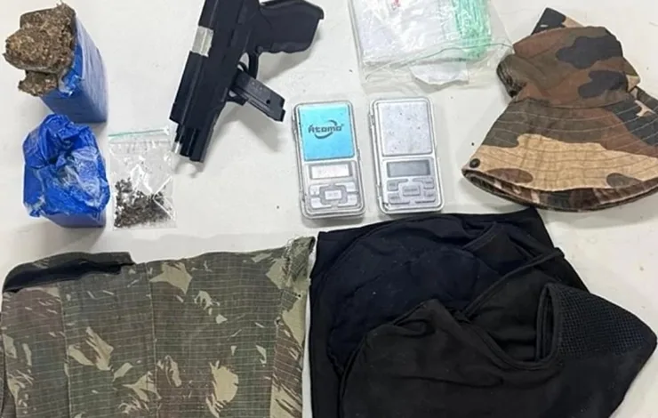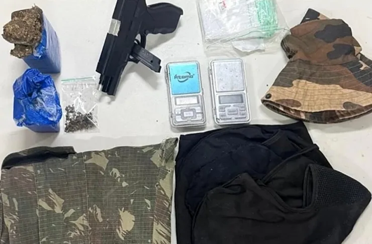 Após varredura no perímetro, os policiais localizaram a mochila, que continha dois tabletes de maconha, duas balanças de precisão, materiais comumente utilizados para a comercialização de entorpecentes e uma réplica de arma de fogo.