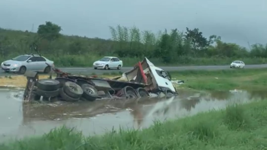 Uma carreta tombou em uma área alagada da BR-324, no trecho entre os municípios de Santo Amaro e Candeias. O…