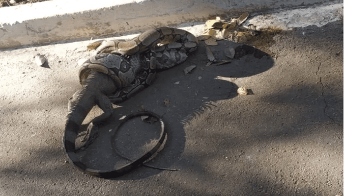 GEROU CONFUSÃO: Jiboia fica com rabo de iguana pra fora da boca ao tentar devorá-la em parque
