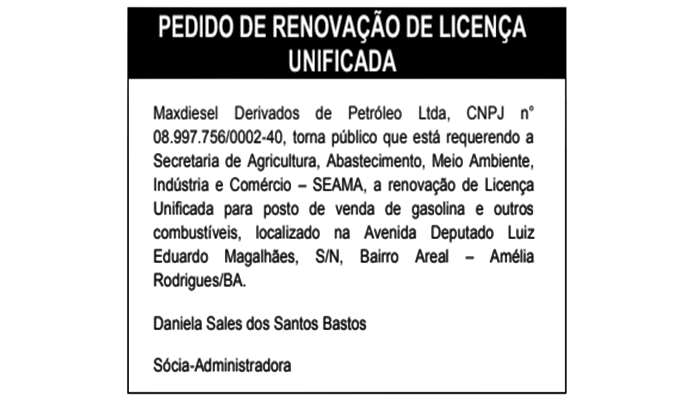 PEDIDO DE RENOVAÇÃO DE LICENÇA UNIFICADA Maxdiesel Derivados de Petróleo Ltda, CNPJ n° 08.997.756/0002-40, torna público que está requerendo a…