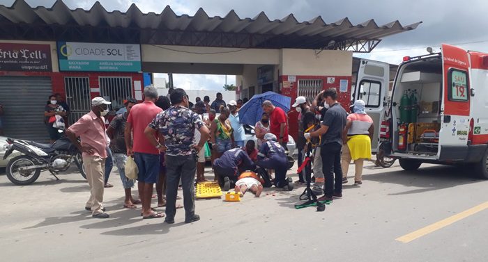 Pedestre colide com idoso em motocicleta defronte à rodoviária de Conceição do Jacuípe
