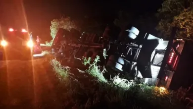 Carreta carregada de frutas tomba na BR-324 e mobiliza socorristas