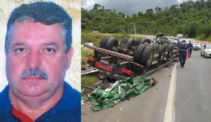 Homem morre e mulher fica ferida após carreta tombar na BR-101