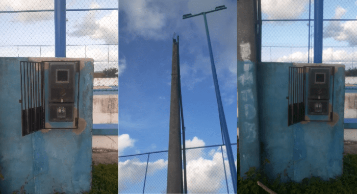 Nas imagens é possível ver que há uma caixa padrão de energia instalada em uma quadra de esportes, que de nada serve, já que não há nenhuma instalação elétrica ou contador no local.