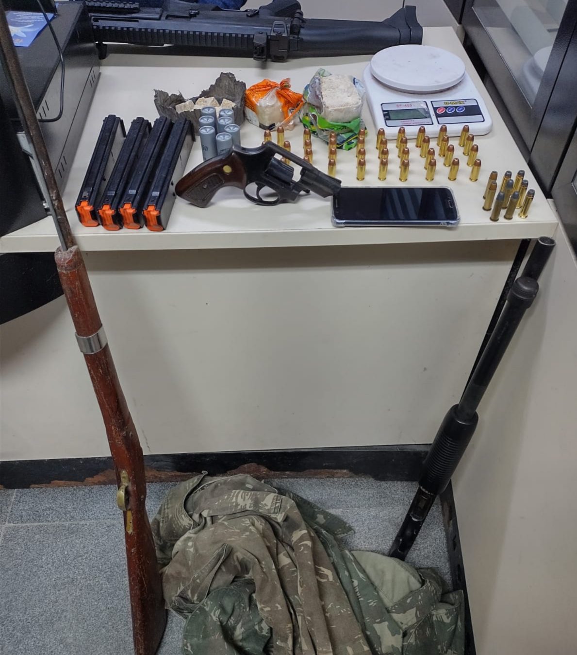 No local, foram encontrados 1 Revolver Cal. 38, munições de vários calibres intactas, 1 Espingarda CBC Cal. 12; 1 CTT Taurus.40; 4 Carregadores de CTT .40; 1 Espingarda de Cal. não identificado; 1 Balança de precisão, 3 Pedras grande de uma substância análoga ao crack e 1 Conjunto de roupa camuflada.