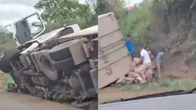 Caminhão tomba e pega fogo na BR-116; parte da carga foi saqueada por populares